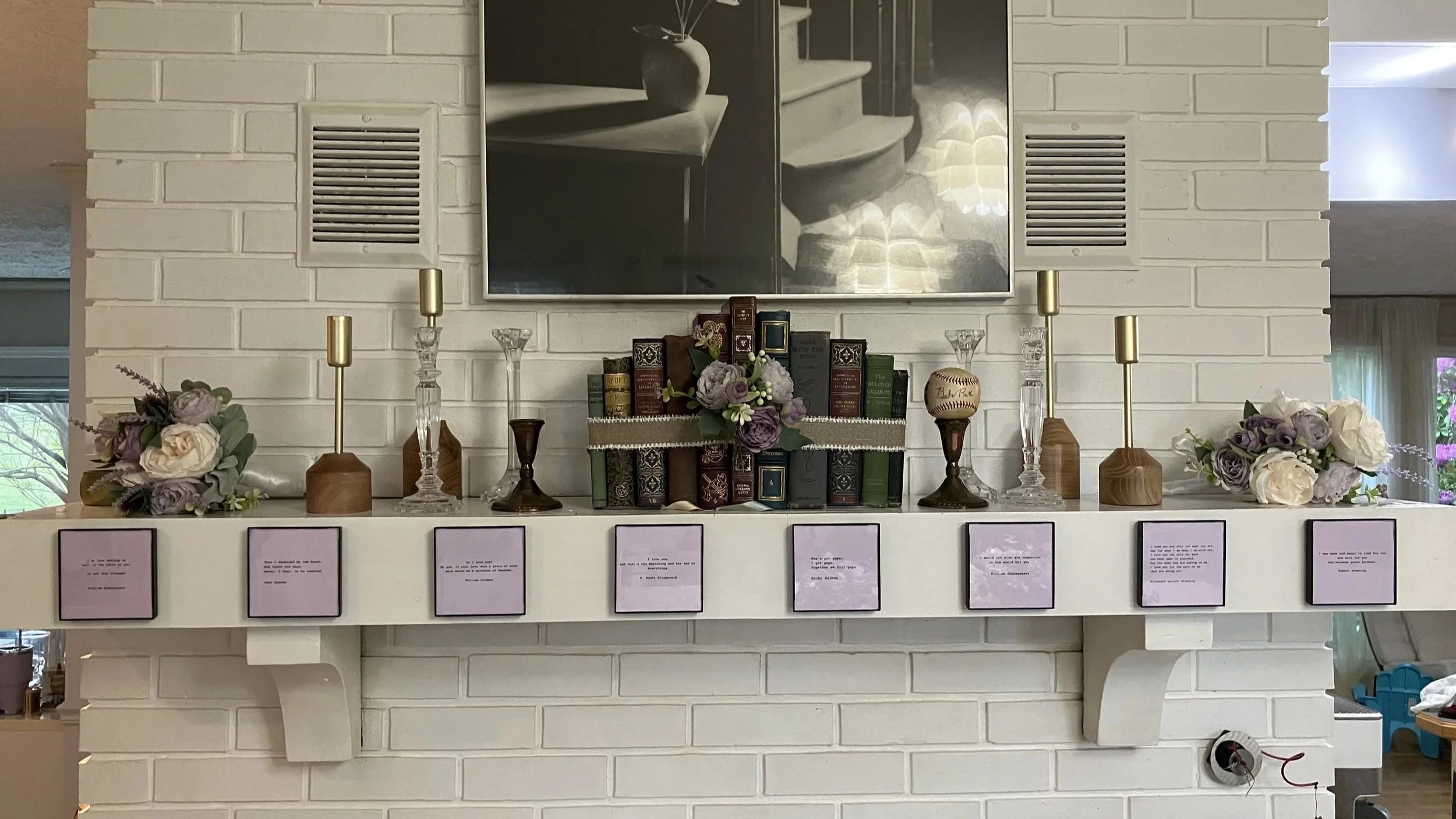 Since our home is architecturally modern, our mantel reflects that style with simple lines. The idea I lighted upon was to use books for decoration. As I wrote about in Through the Wardrobe: The Book Nook, I have the privilege of a generational library filled with old books that display beautifully. It was these books coupled with Easten Press editions that I used to create a beautific literary landscape throughout my home. Then, because my sister in law is a great lover of the classics, I decided to mock up a dozen 4x4 frames with wonderful quotes from some of literature’s greatest contributors and Katelin’s particular favorites: F. Scott Fitzgerald, William Shakespeare, Edgar Allen Poe, et cetera. The color scheme was amethyst, so I had the quotes printed on lavender backgrounds in a Courier font to mimic a typewriter. Then I affixed each 4x4 frame with command strips to the sides and front of the mantel. It captured the romance of the occasion to perfection.
